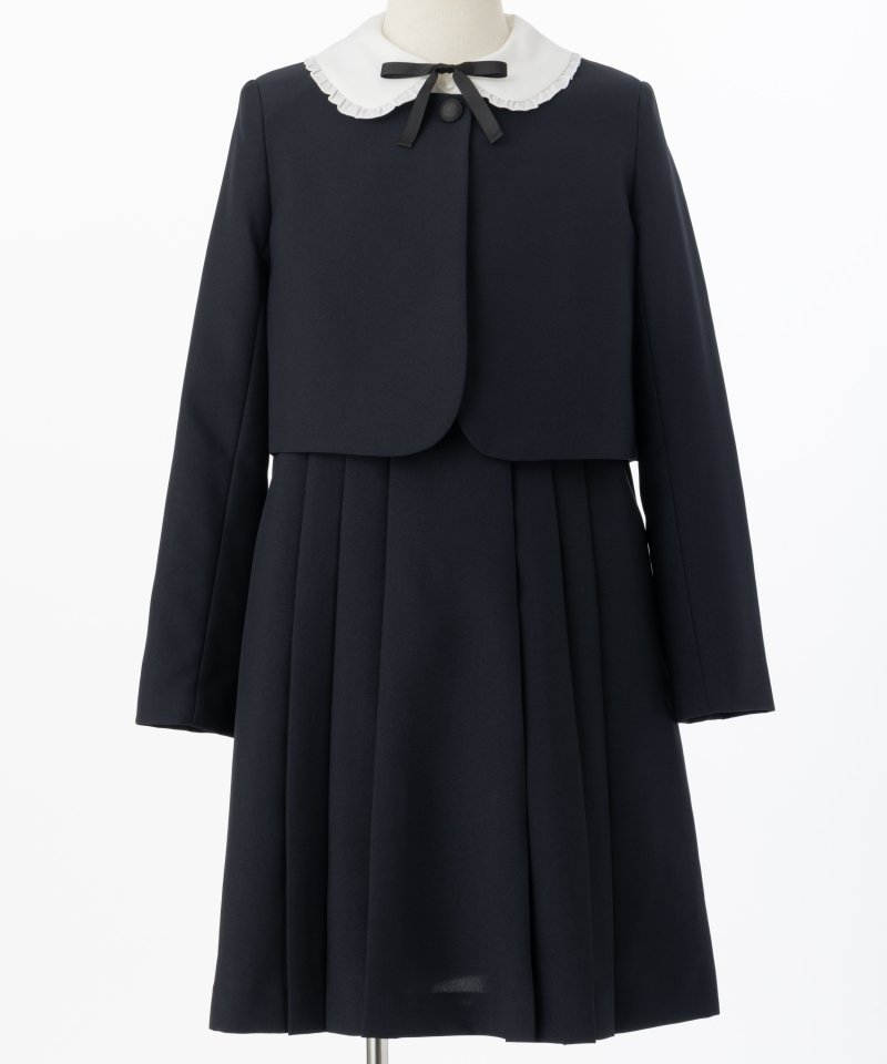 ワンピース・ブラウス・ボレロ3点セットのフォーマル用キッズスーツです。リボンは取り外しができますので、好みに合わせたコーディネートが可能です。略礼装としておすすめのネイビーカラーですので、急なお通夜や法事法要、家族葬などに適しています。ボレロ、ジャンパースカートで使用しているボタンも弔事用に適したマットな黒ボタンを使用していますので安心して着用いただけます。