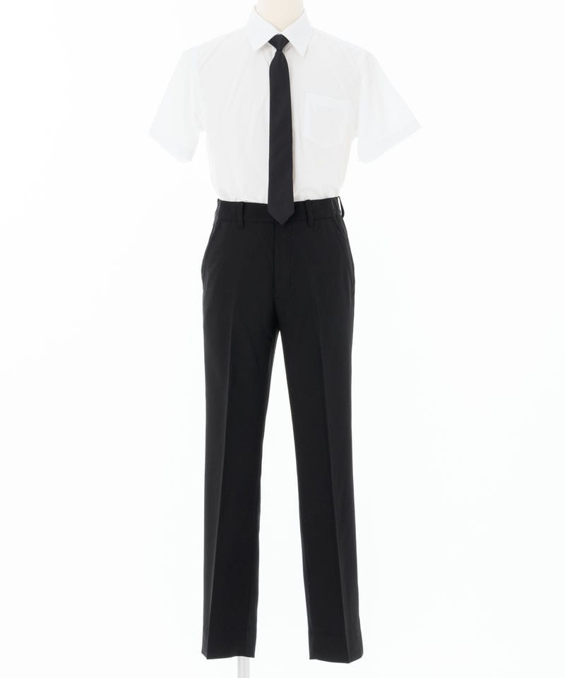 シワになりにくいポリエステルとコットンの混紡シャツはハリ感がありサラリとした肌触りです。ワンタッチで着脱できる弔事用のネクタイ付きです。薄っすらとヘリンボーンの織り柄が入っており、制服感を感じさせないフォーマル度の高い一着です。シャツ
