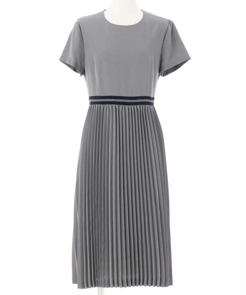 スリムプリーツが特徴の半袖ワンピース。ひざがしっかりと隠れる着丈になります。