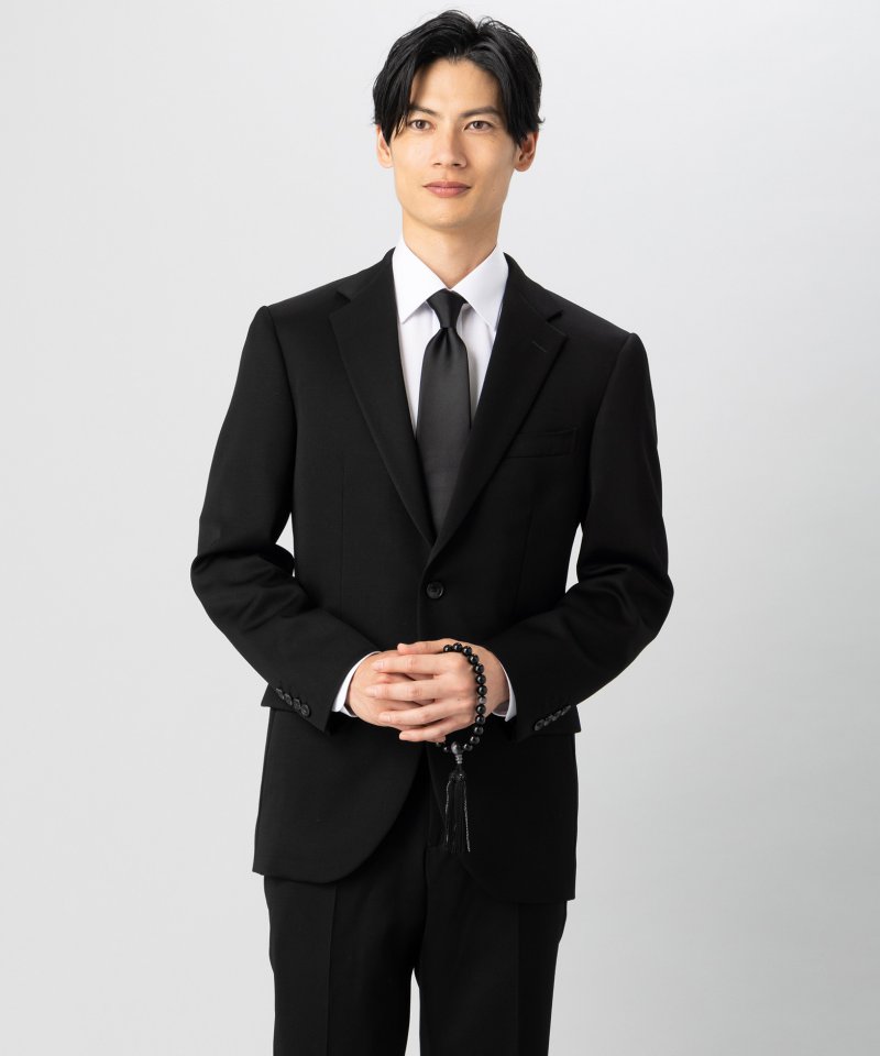 タキシードスーツにも使用される濃染生地「タキシードクロス」を使用した上質なブラックフォーマルスーツ。しなやかで上質な質感が特徴です。2度の濃染染めを施した“漆黒”は周りと並んだ際にその差が歴然とします。シルエットは「レギュラーフィット」を採用。ラペル(襟)はやや太めに、ウエストのシェイプを緩やかにしスラックにはタックを入れることでゆったりとした男性的なシルエットで着用いただけます。襟ステッチや袖の重ねボタンなどの飾りを省き喪服に特化した格式ある仕様にこだわった一着です。