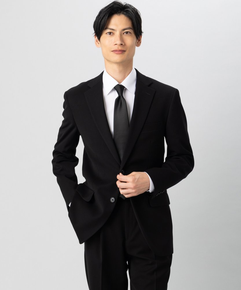 濃染加工を施したLUNA ・BLACK生地のフォーマルスーツです。ポリエステル100%とは思えないほどキメが細かく、ボディに馴染じむしなやかさが特徴。ジャケットは細身すぎないレギュラーフィット、スラックスはワンタックで緊張感のある場や長時間の着席でも窮屈感を軽減してくれます。光の反射が少ない「漆黒」生地を使用していますので、準喪服として親族の方から一般弔問の方まで、全ての弔事シーンで着用いただけます。