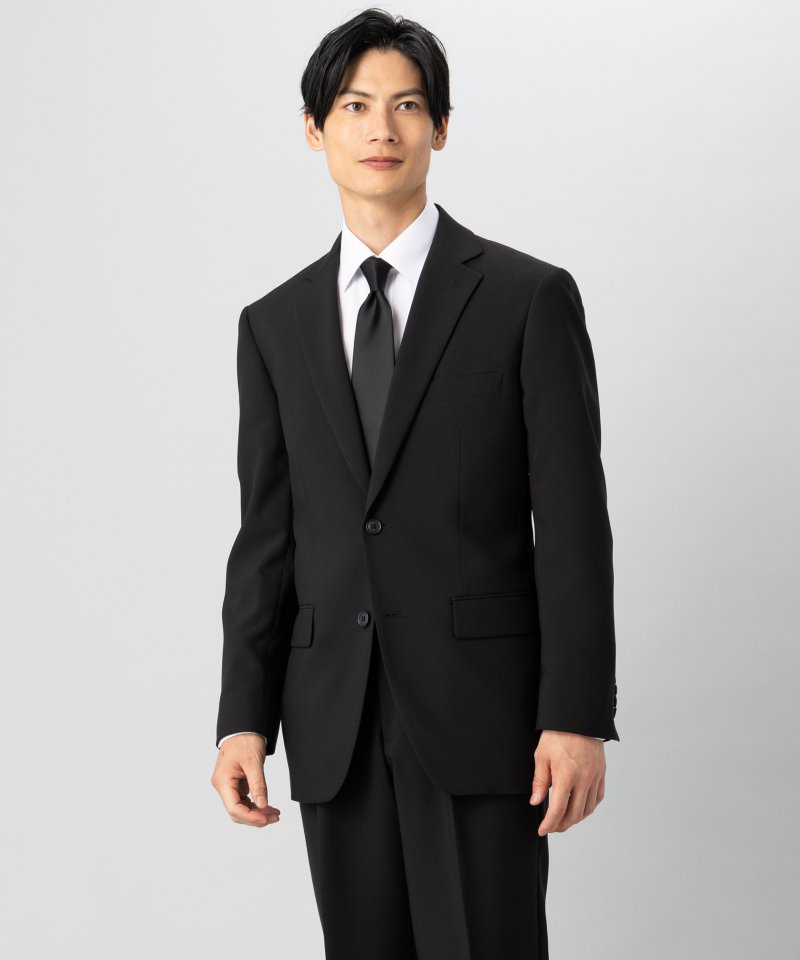 略礼装・平服用に、ポリエステル100%のベーシックなブラックスーツをご用意しました。ポリエステル素材特有のハリ感とライトな着心地。ジャケットは程よいゆとりのあるレギュラーフィット、スラックスはスリム体型を生かしたノータックでスタイリッシュに着て頂けます。